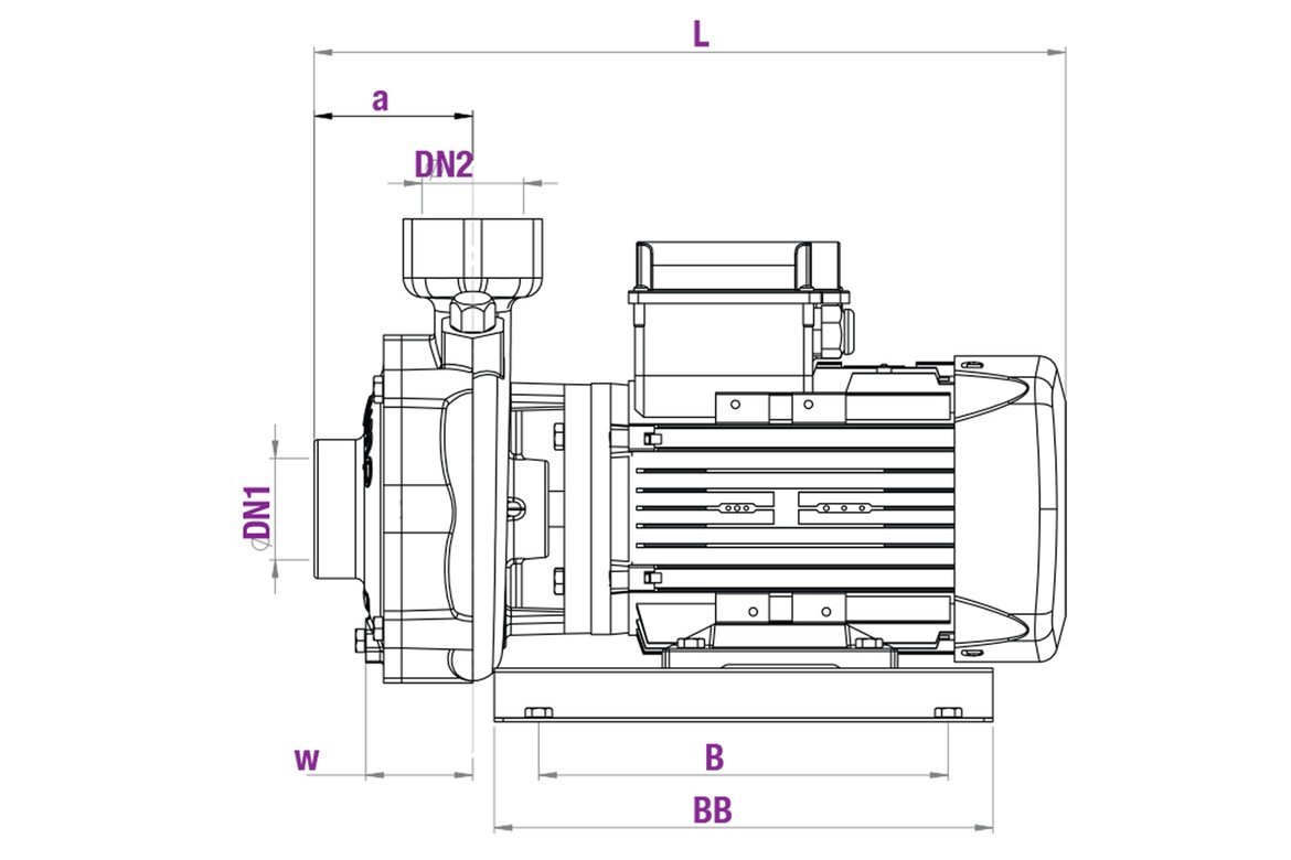 | Monophasig | Dreiphasig | Hp | Kw | Saug DN1 | Pumpvorgang DN2 | L | N | h1 | h2 | h | a | w | A | AB | B | BB | 1~ | 3~ |