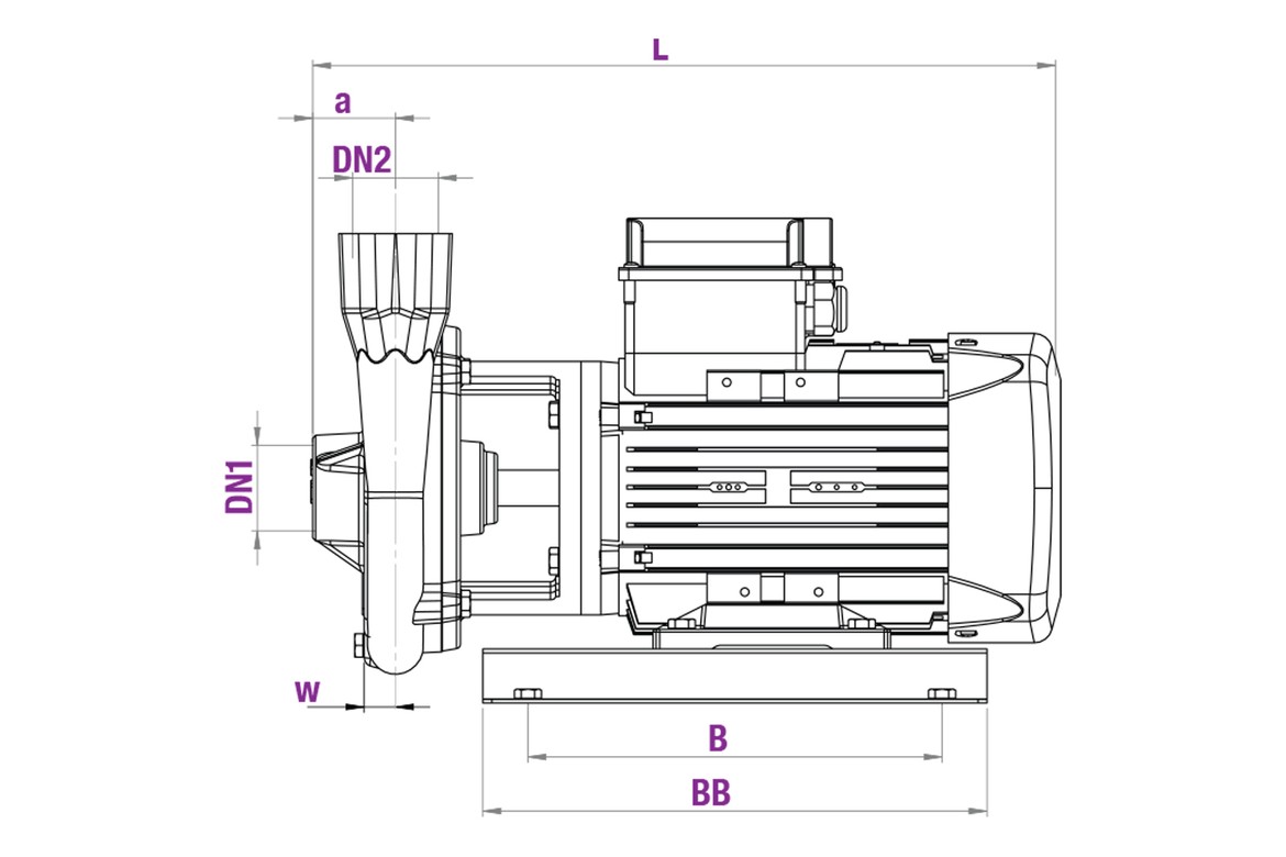 | Monophasig | Dreiphasig | Hp | Kw | Saug DN1 | Pumpvorgang DN2 | L | N | h1 | h2 | h | a | w | A | AB | B | BB | 1~ | 3~ |